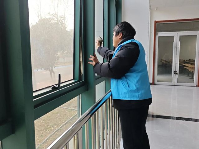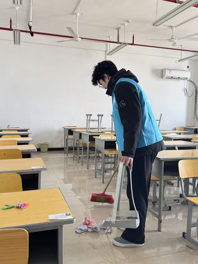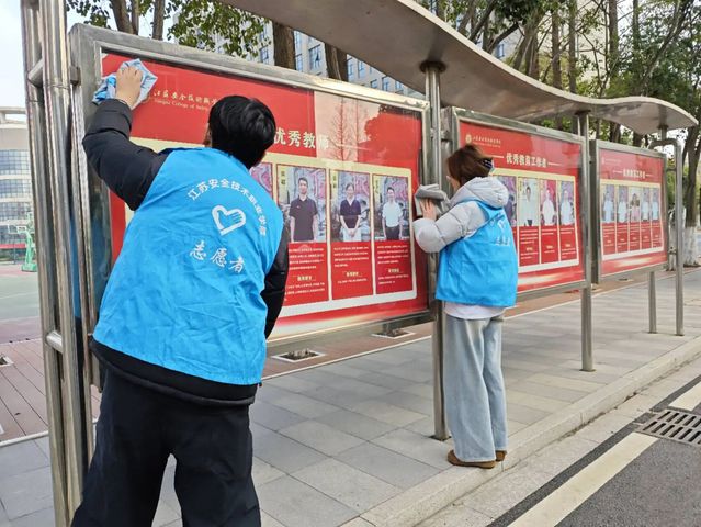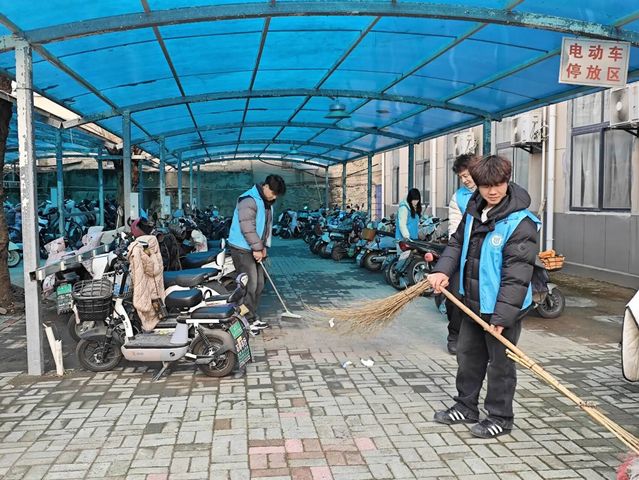 活动中,志愿者们分工协作、热情高涨,一抹抹“志愿红”活跃在校园各个角落。车棚里,大家俯身清扫地面杂物,细心摆放车辆,原本杂乱的区域变得井然有序;教学楼内,志愿者们耐心擦拭门窗、扶手,清洁地面,不放过任何一个卫生死角;公示牌前,同学们用抹布一点点擦去积尘与污渍,让信息栏重新焕发光彩;图书馆中,大家细心整理书架、归位图书,为师生营造出整洁舒适的阅读环境。一个个忙碌的身影,成为春日校园里最温暖的风景。